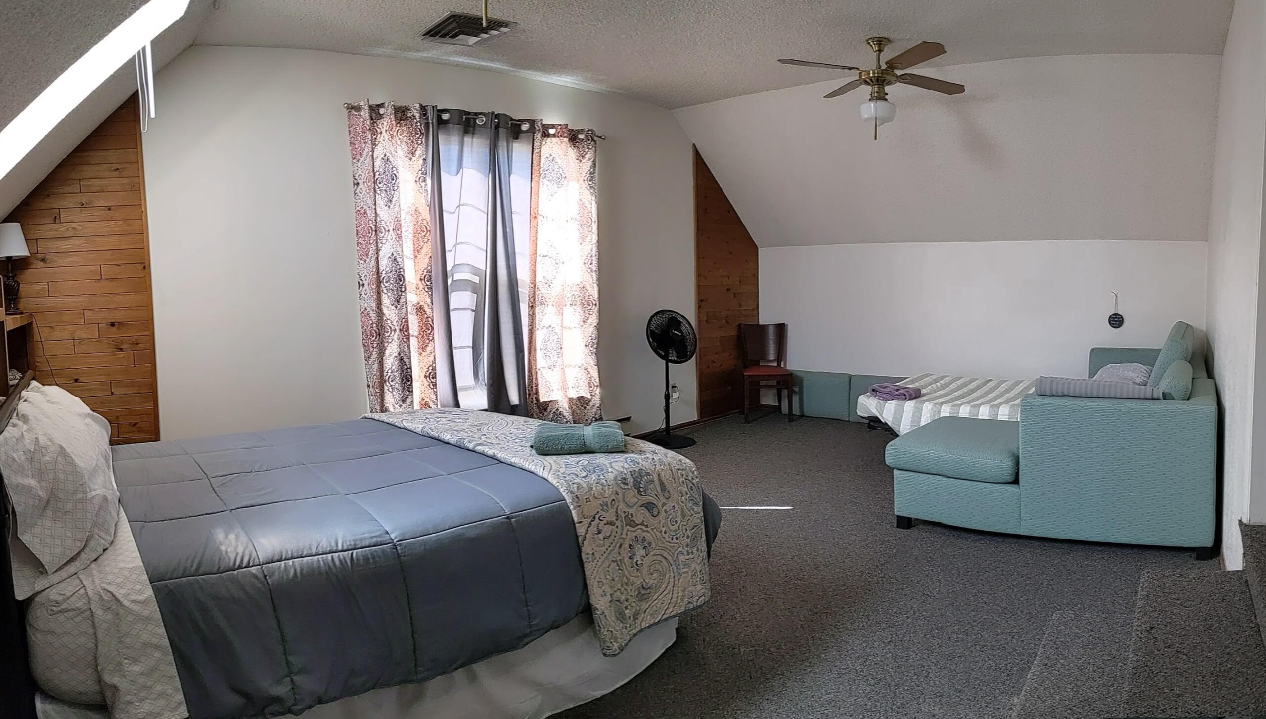 Featuring sloped ceilings and a view of the backyard, the Dominguez room offers a serene stay with a single queen bed, perfect for travelers who want time to themselves.