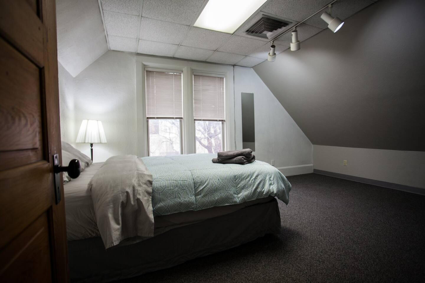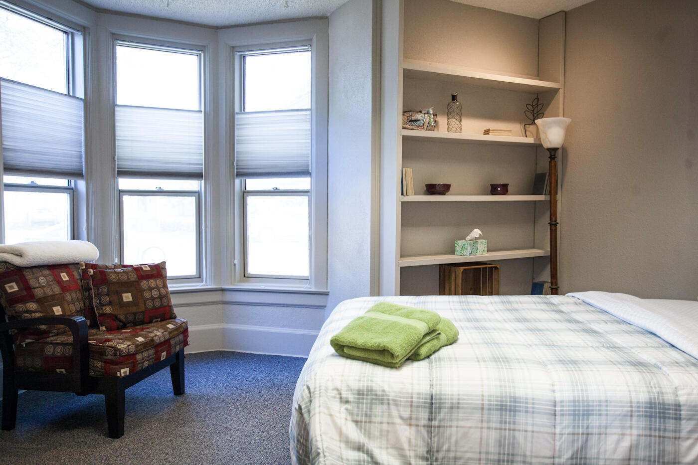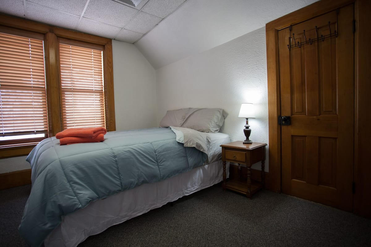 The Grand Mesa Room, the prime barrister's office when the Rood House was used as a law firm, features arresting bay windows that create a comfortable reading area for guests. With one queen size bed, this room is great for a couple looking for a unique and cozy stay.